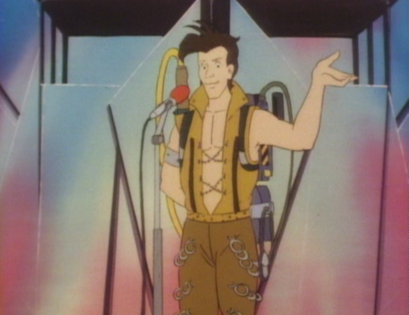 -Initial outfit: Ghostbusters uniform(brown w/ greenish-teal accents) with t-shirt and jeans underneath